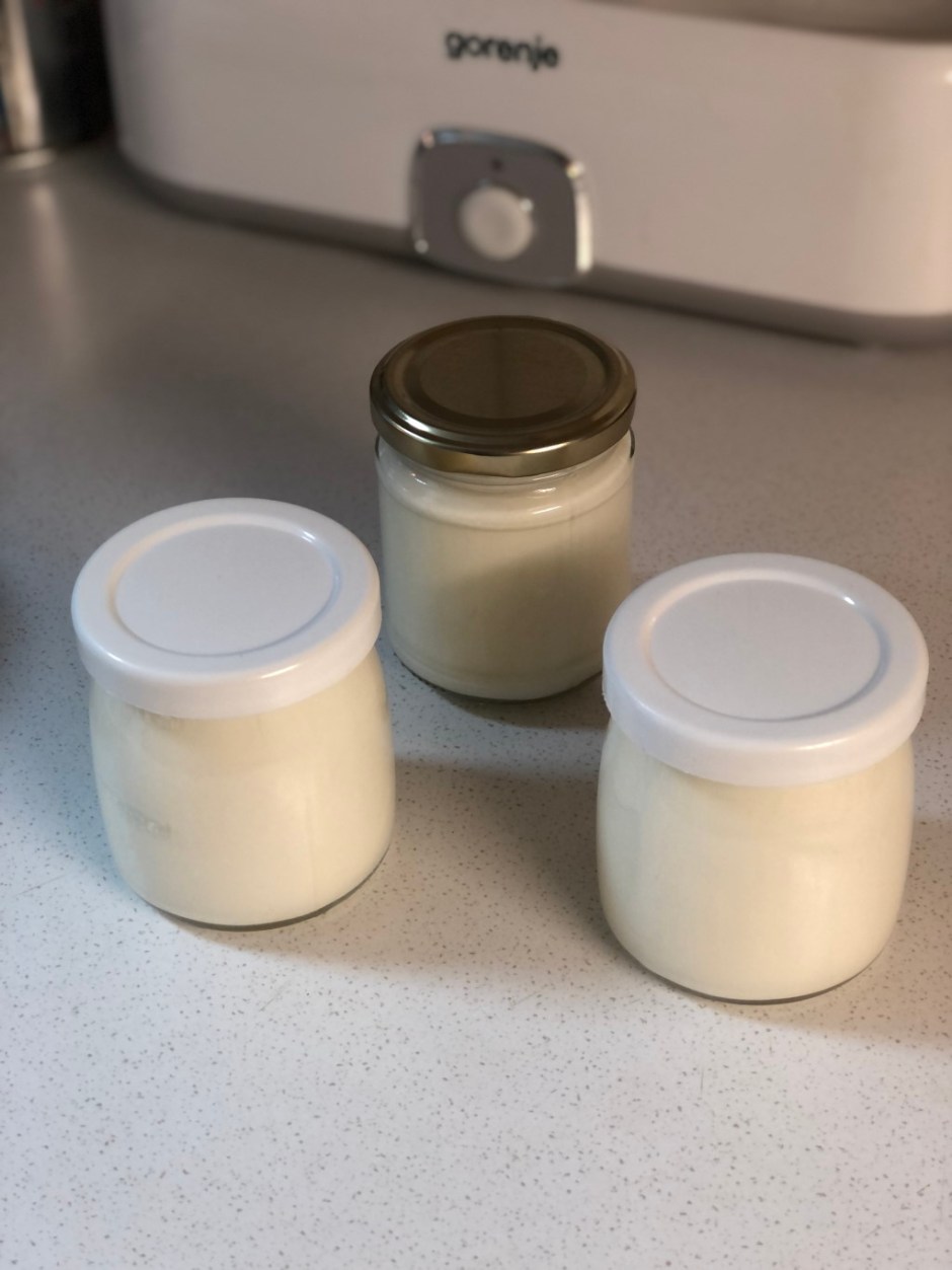 - Vsebino v vsakem lončku premešaš. Lončke zapreš in jih za 8 – 9 ur postaviš v jogurtomat 😀