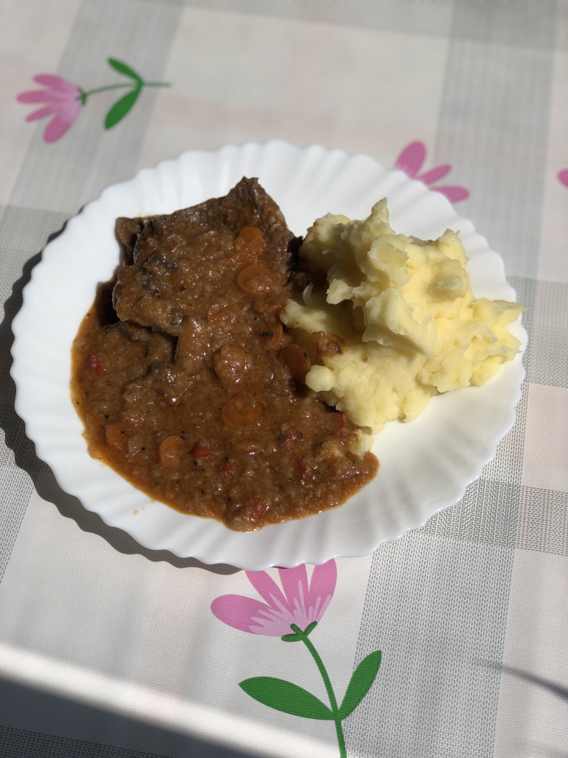 Omako in goveje zrezke narediš po tem receptu (v tem receptu so v omaki tudi gobice, ki jih v tej verziji omake, ki jo vidiš na zgornji sliki, nisem uporabila – ampak itak lahko sestavine čisto po želji variiraš 😉). Krompir pire, pa verjetno že znaš narediti sam/a 🙃