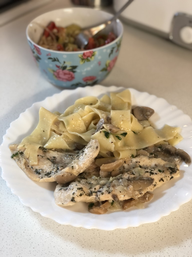 - Korenje, gobe in piščanca (tega prej še začini s soljo in poprom) narežeš na majhne koščke in jih streseš v ponvo. Vse skupaj zaliješ z malo vode, pojačaš plin in pokriješ s pokrovko. Kuhaš približno 30 min.